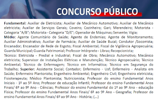 Médio: Agente Comunitário de Saúde; Agente de Endemias; Agente de Monitoramento; Auxiliar Administrativo; Auxiliar de Farmácia; Auxiliar de Saúde Bucal; Condutor /Socorrista; Encanador; Encanador de Rede de Esgoto; Fiscal Ambiental; Fiscal de Vigilância Agropecuária; Guarda Municipal; Guarda Patrimonial; Professor Intérprete - Libras; Recepcionista;